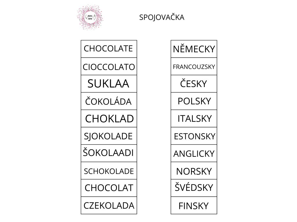 Spojovačky a přesmyčky – trénink pozornosti a slovní zásoby (čokoláda v různých jazycích, anagramy).