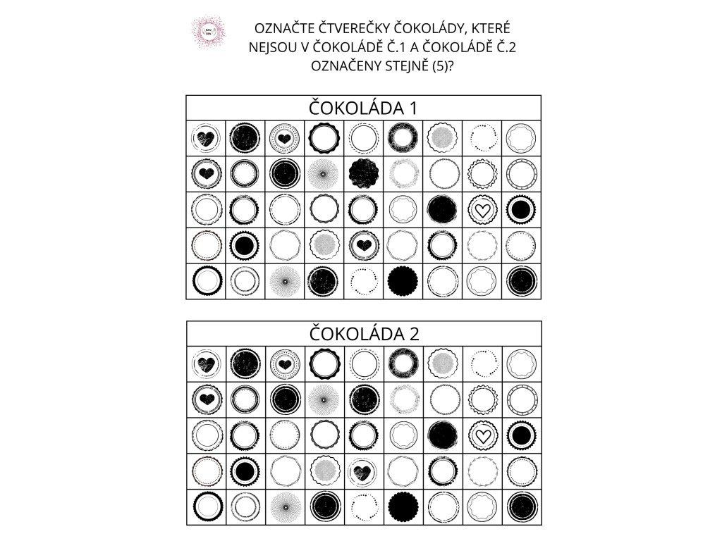 Vyhledávání slov – najděte slova „čokoláda“ v textu, označte správný počet obrázků či čtverečků.