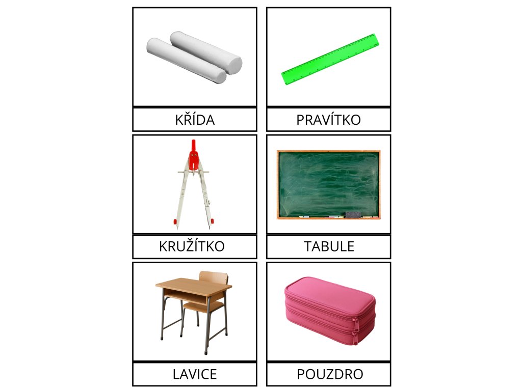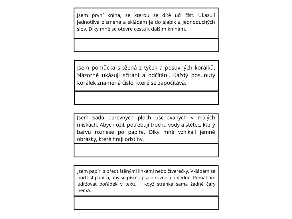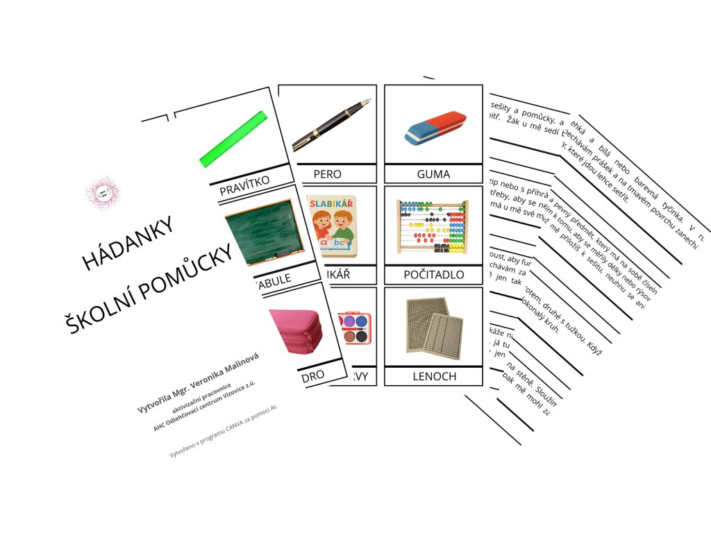Sada 12 originálních hádanek na téma školních pomůcek, které zábavnou formou procvičují představivost, logické myšlení a slovní zásobu. Každá hádanka vede k tomu, aby podle popisu bylo možné poznat známé předměty ze školního prostředí – například tabuli, kružítko, pero nebo vodové barvy.