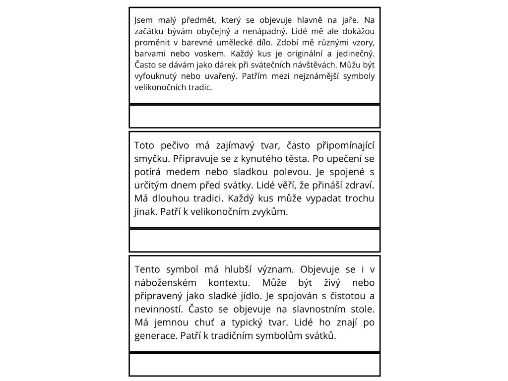 Obsahují soubor tematických hádanek o symbolech Velikonoc.