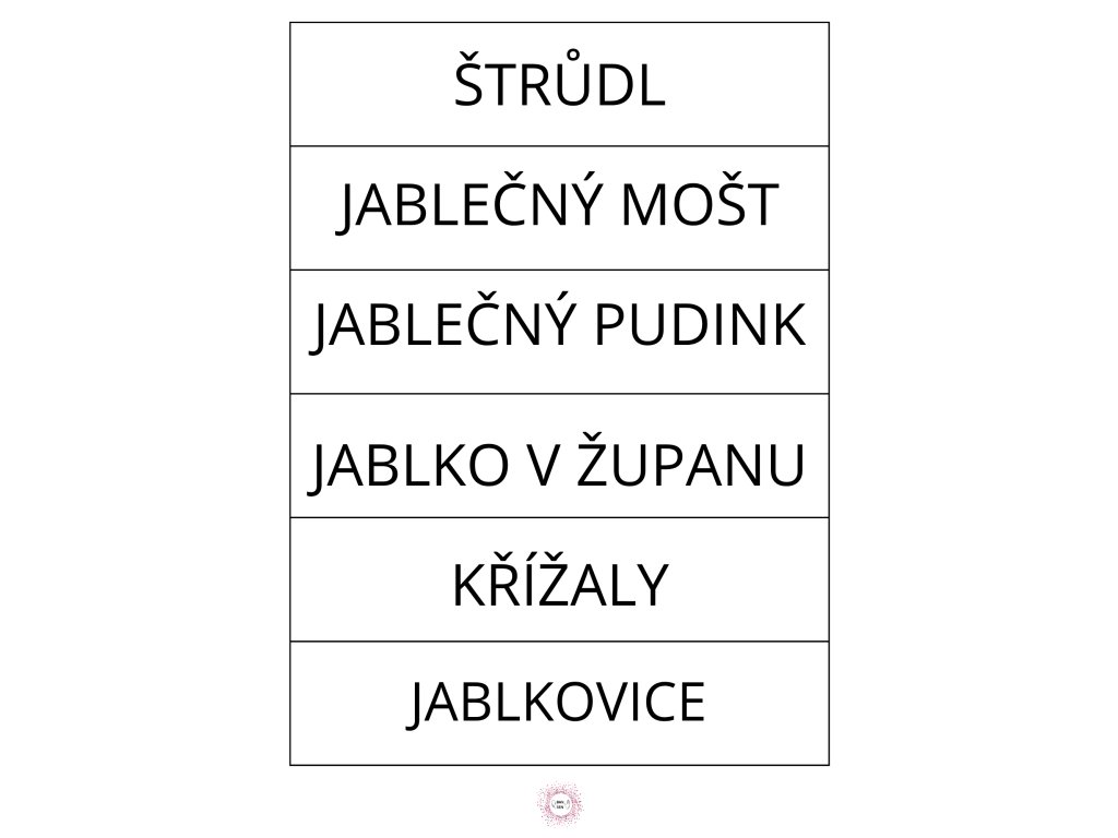 Součástí jsou také popisy jablečných pokrmů, které podporují slovní zásobu a porozumění textu.