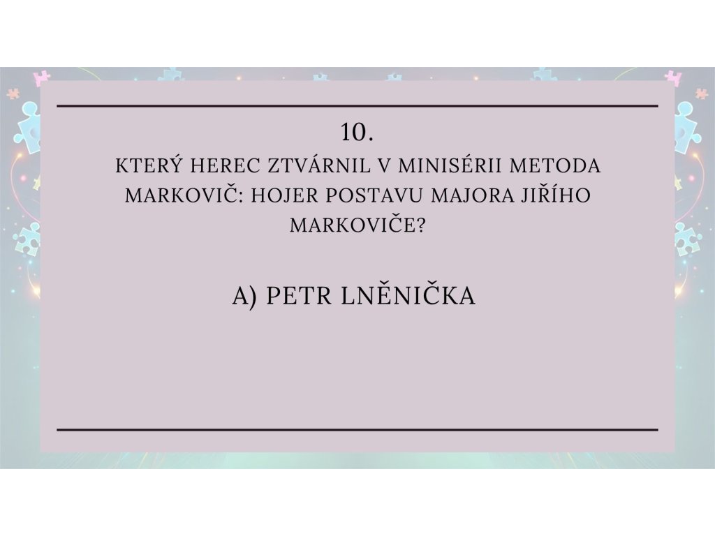 Prezentace je systematicky rozdělena: vždy po 10 otázkách následuje blok se správnými odpověďmi.